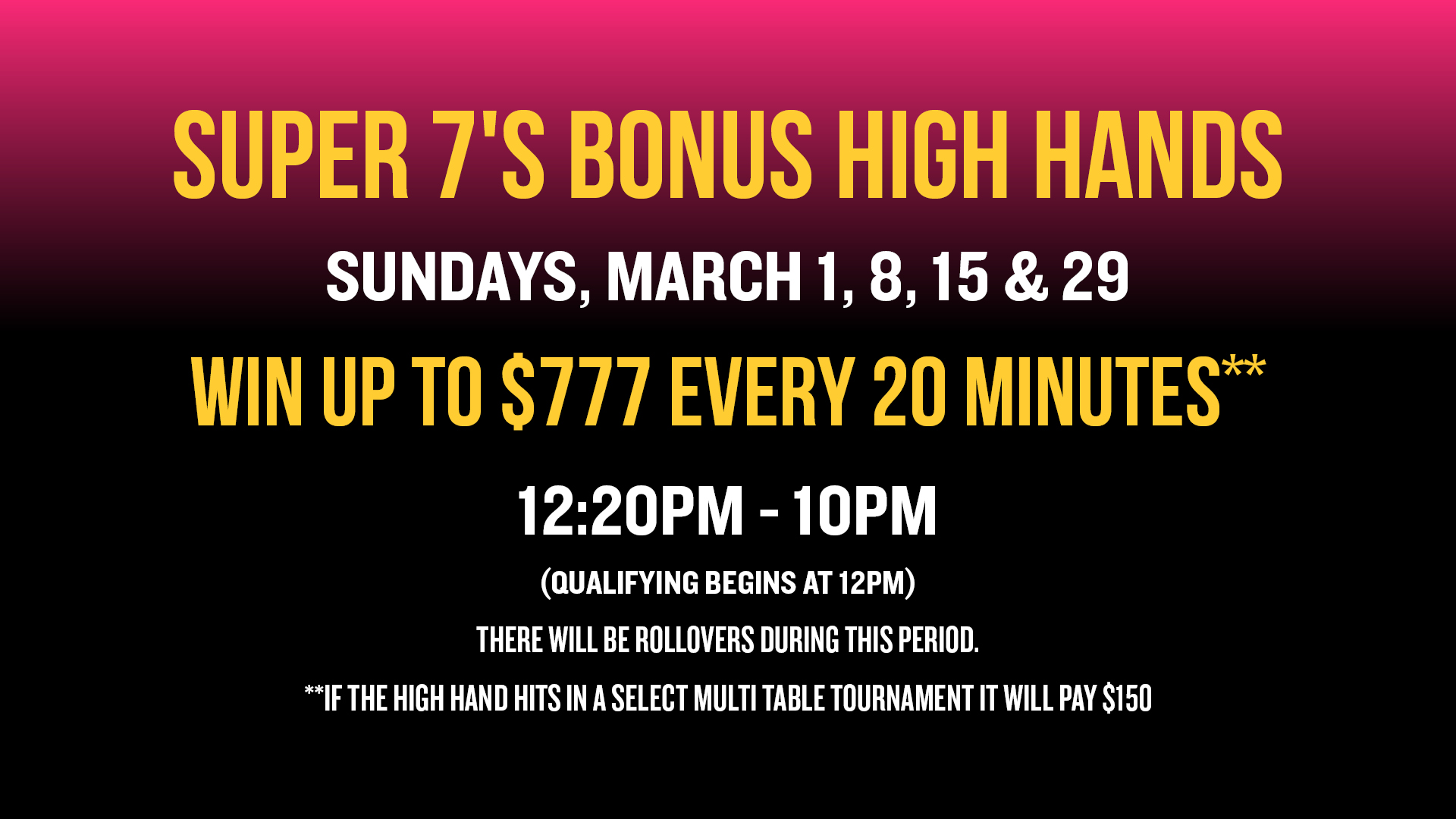 | Thu, Mar 12 | 6P | $150 | $20,000 | Yes | Triple Stack | |