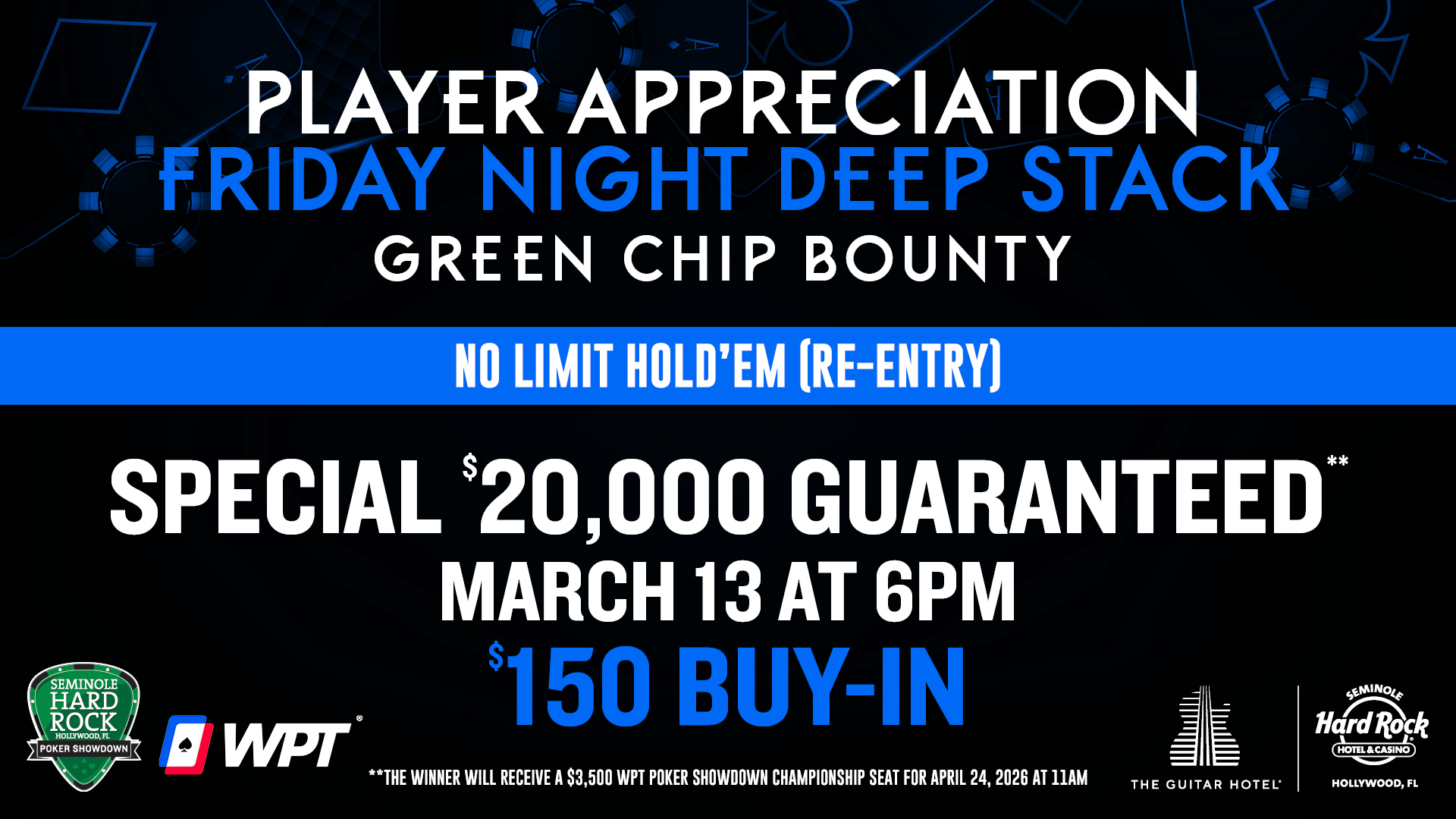 | Fri, Mar 13 | 6P | $150 | $20,000 | Yes | Deep Stack Single Green Chip Bounty | |