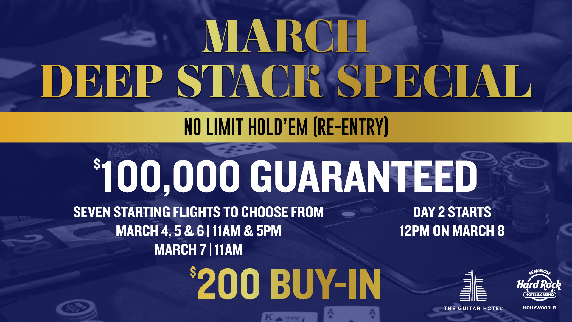 | Fri, Mar 6 | 11A | $200 | $100,000 | Deep Stack $100K GTD Flight E | ||