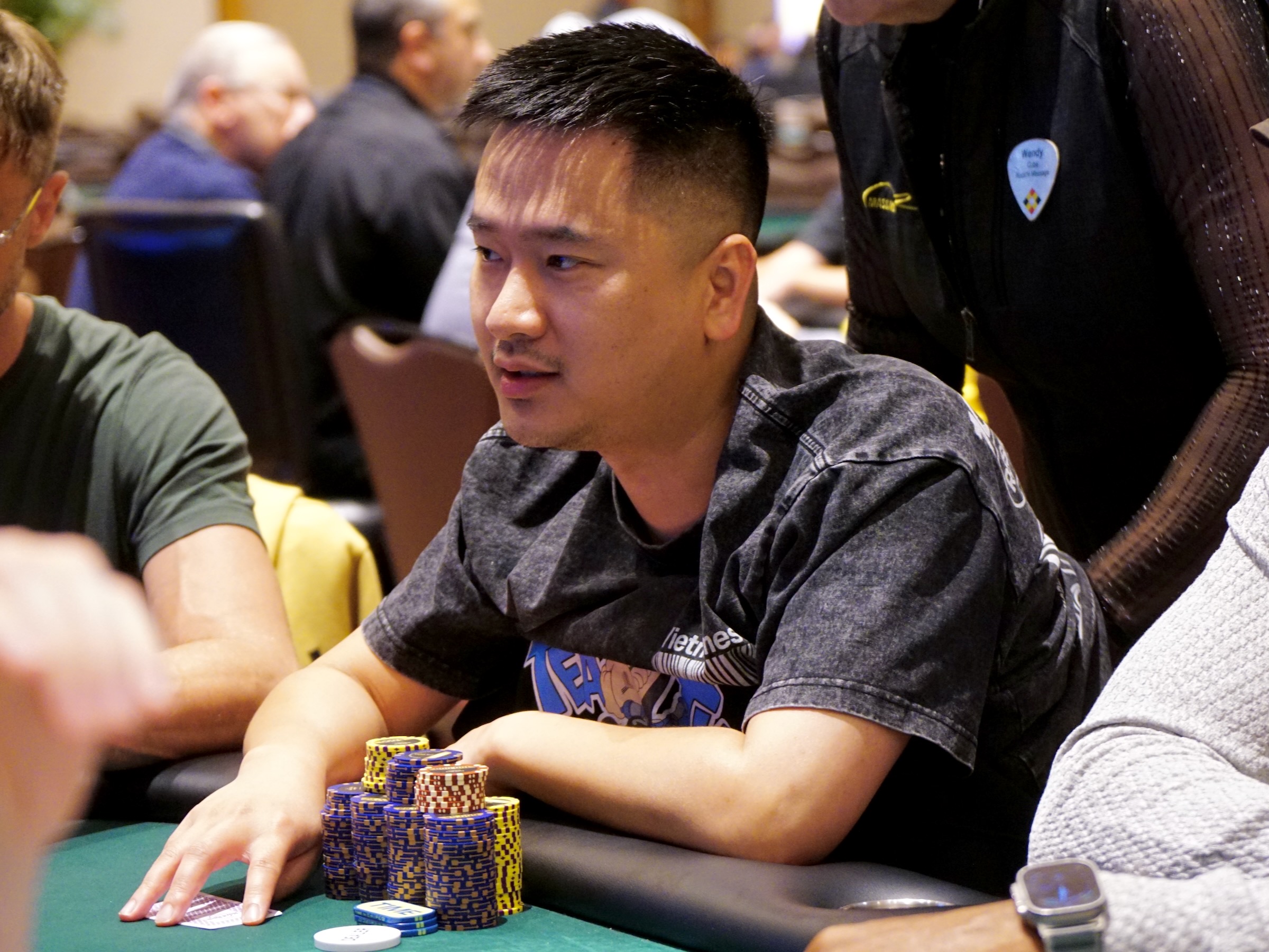 , Neil Warren bet 15,000 from early position and Elvyn Bello raised all in with a covering stack. After a little while in the tank, Warren called all in for about 42,000.