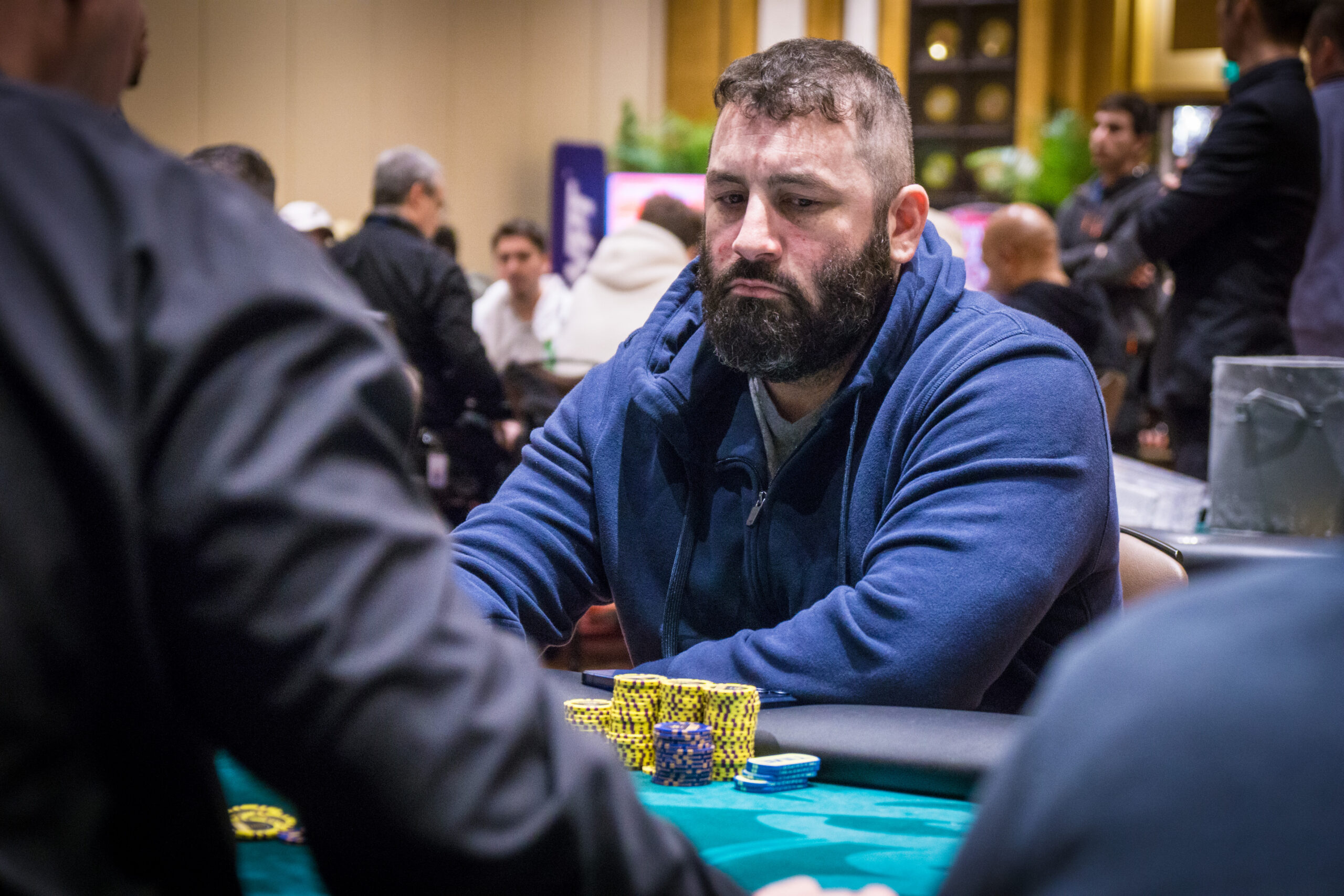 With 18 players remaining from a field of 1,417, the average chip stack is around 3,925,000 (39 big blinds). The remaining players are guaranteed at least $38,500.