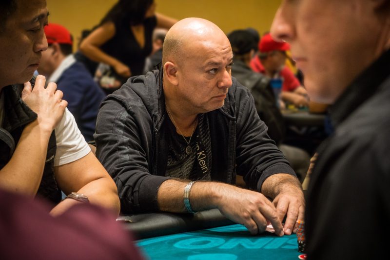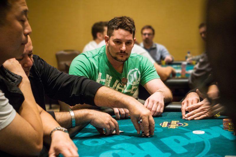 Michael Quinn is moving in the right direction this afternoon. Our “Win a Seat” drawing winner made Day 2 with a nice stack and picked up back-to-back hands to build it higher.