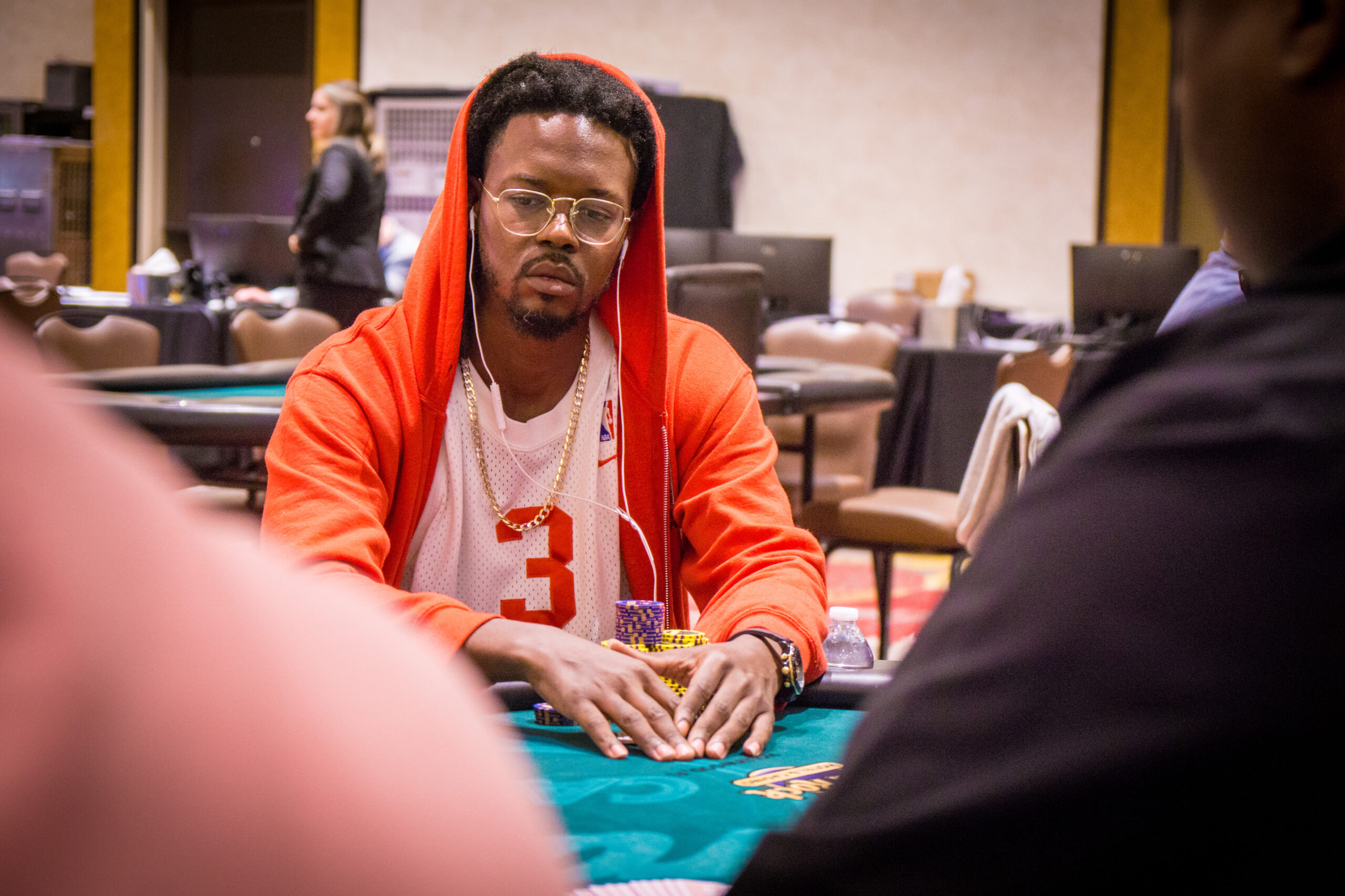 Tyrell Atkinson continues to increase his lead in the championship after the most recent break with a monster stack worth 1,275,000. That gives him over 200 big blinds to work with on the path to the money bubble.