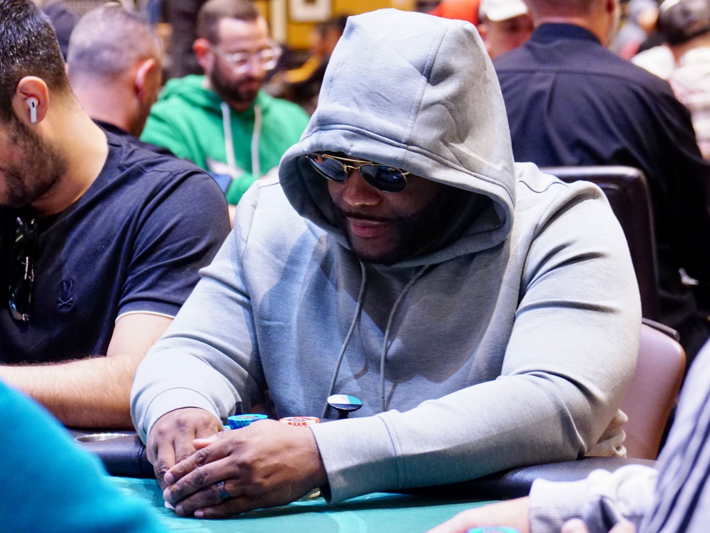 Leroy Grant moved all in from middle position for 550,000, Parminder Clemente called all in from the hijack for about 365,000, and the player in the big blind called, covering both players.