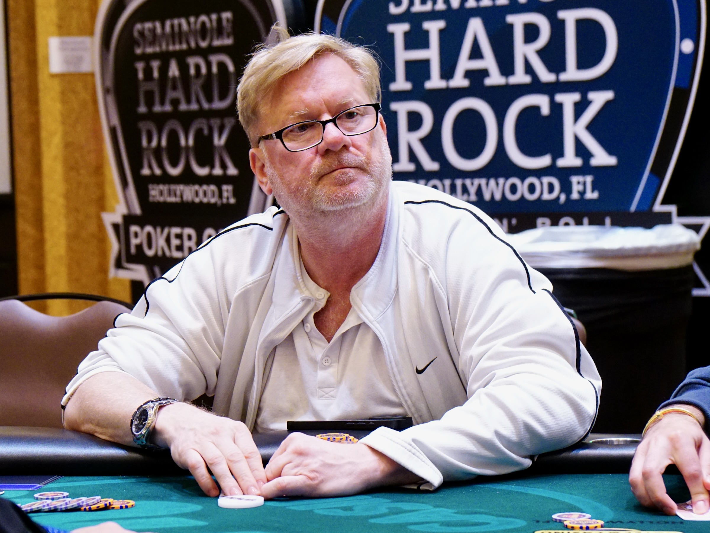 With seven players remaining from a field of 108 entries, the average chip stack is around 386,000 (24 big blinds). The remaining players are guaranteed at least $2,190 each.
