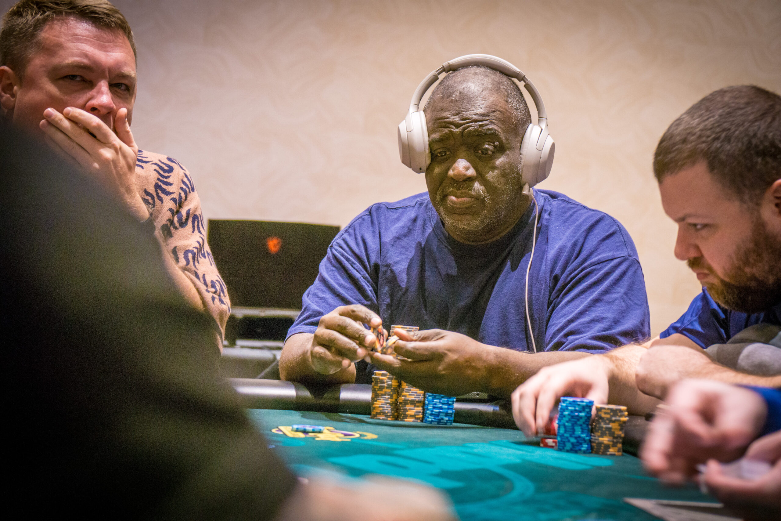 We found two big stacks, one over three million and one dead on it. Rafael Abrahamyan leads the field with 3,165,000 while Theo Lawson sits second with 3,000,000 on the dot.