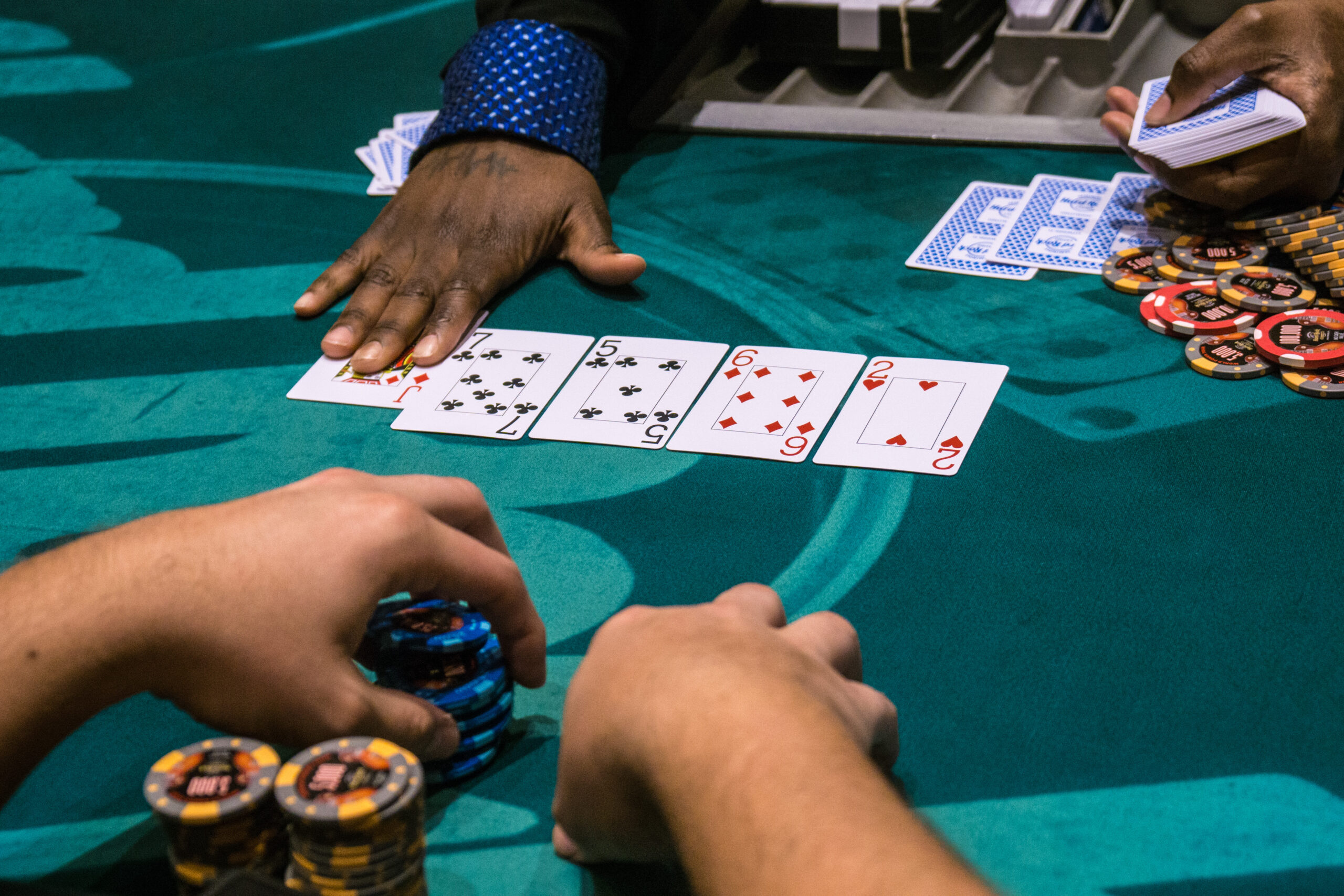 We missed the preflop action but reached Table 7 right as the last chips went into the middle in a three-way all-in pot.