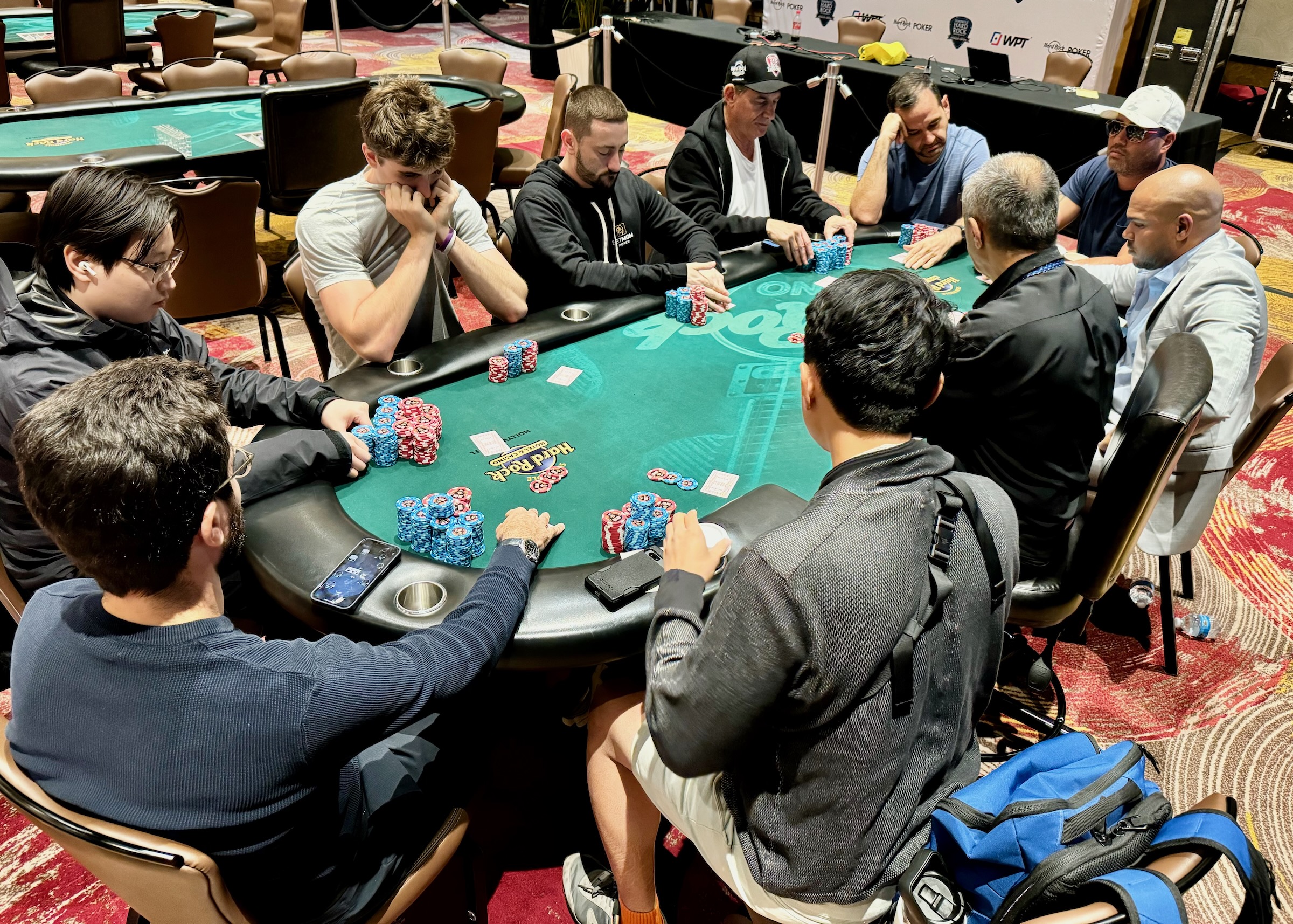 After the elimination of Kevin Paustenbach in 10th place, the final nine players redraw for random seats at the final table. With nine players remaining from a field of 699, the average chip stack is around 7,775,000 (26 big blinds).
