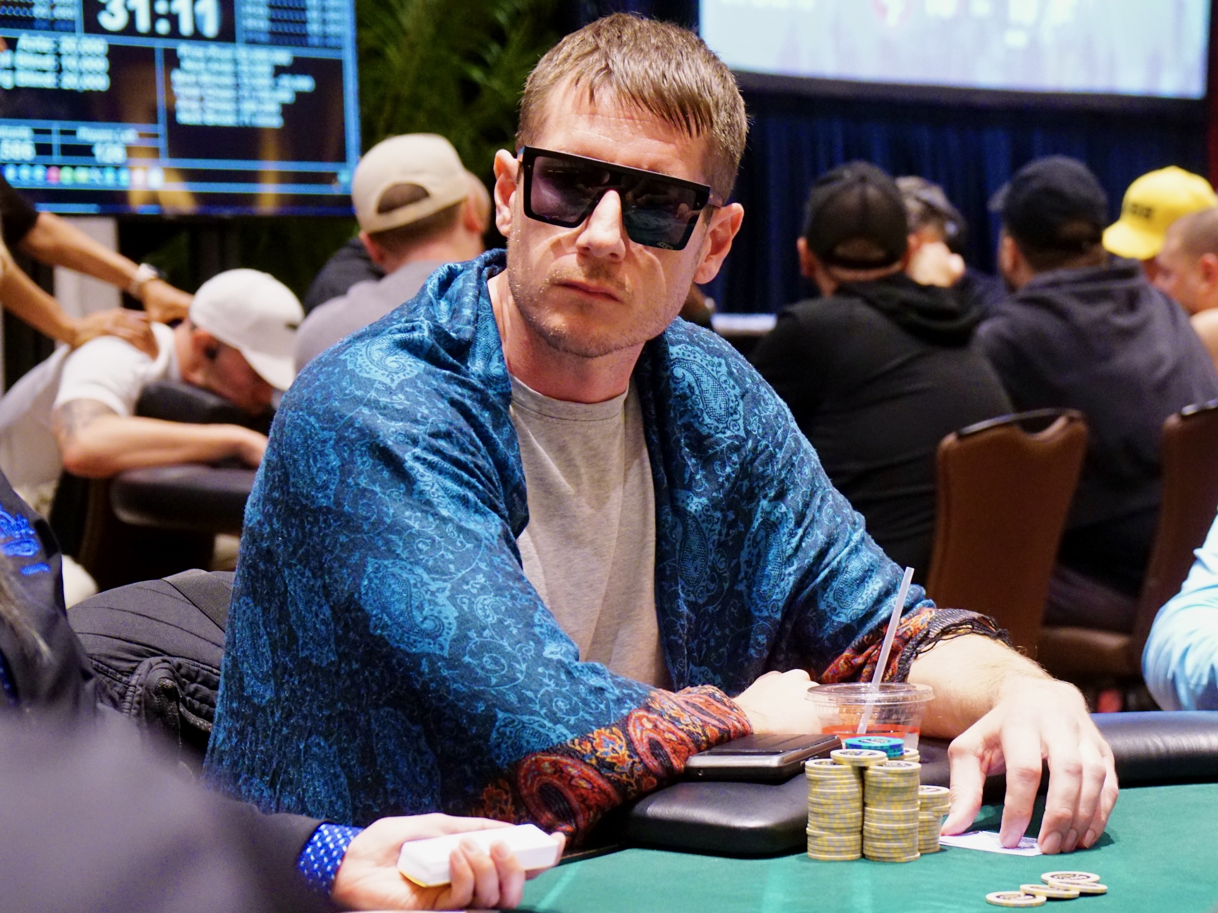 With 118 players remaining from a field of 3,586, the average chip stack is around 610,000 (31 big blinds). The remaining players are guaranteed at least $2,240 each.