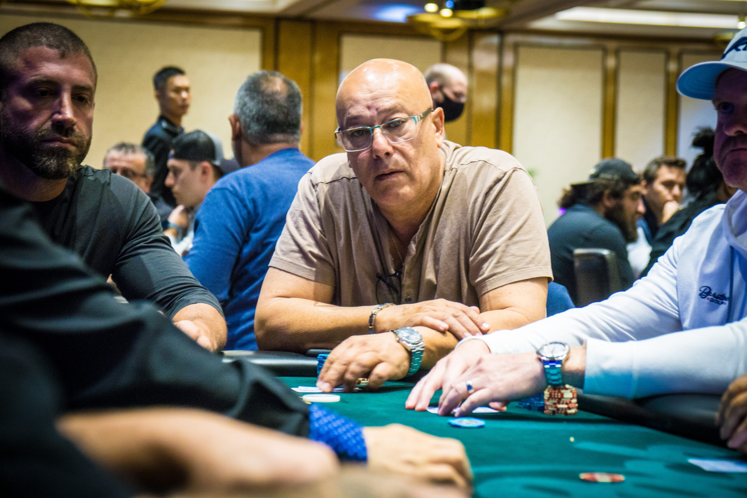 With 11 players remaining from a field of 5,658, the average chip stack is around 10,275,000 (26 big blinds). The remaining players are guaranteed at least $18,200 each, and the next pay jump is $22,700 for 10th place.