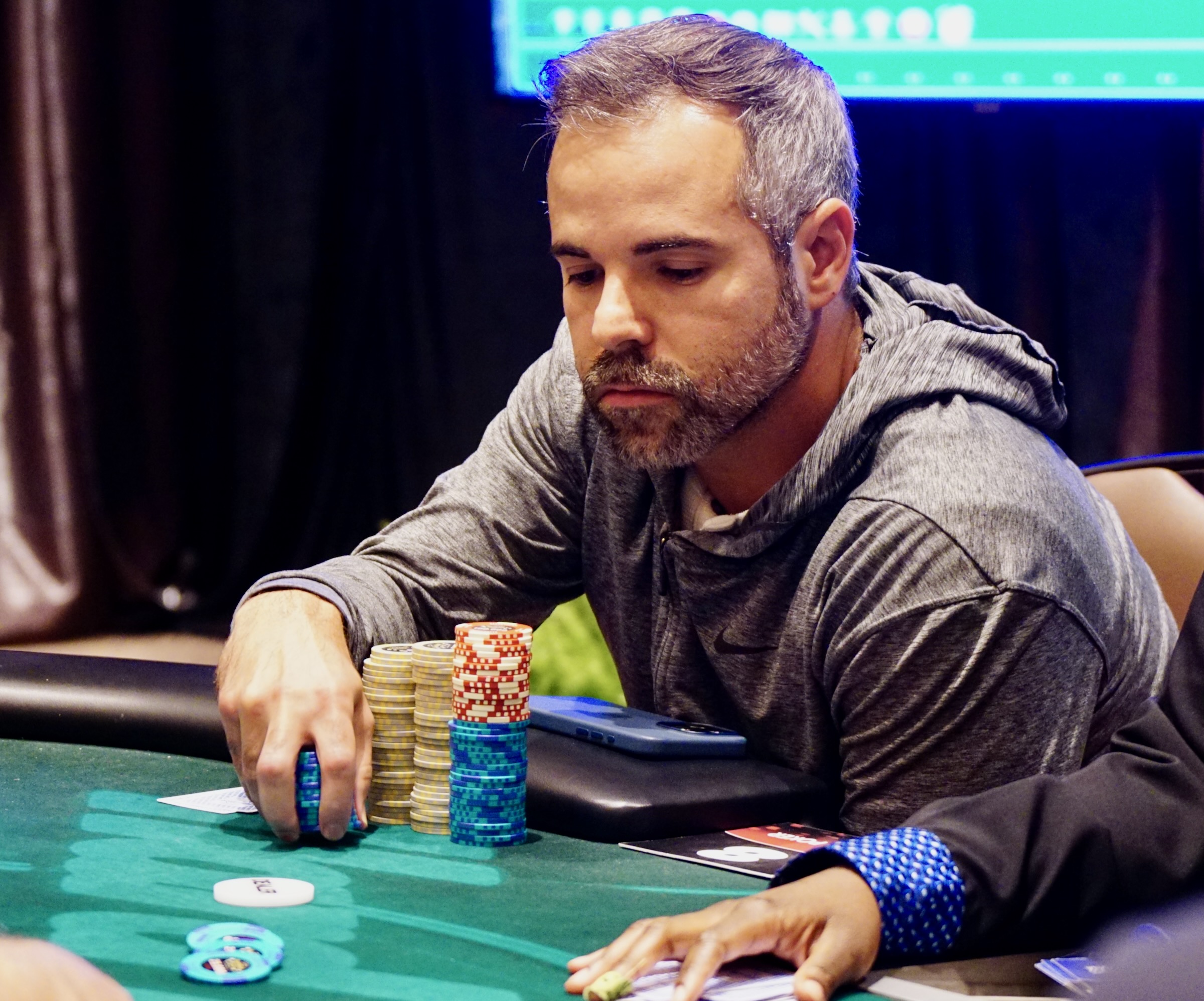 With 63 players remaining from a field of 5,658, the average chip stack is around 1,795,000 (30 big blinds). The remaining players are guaranteed at least $3,480 each, and the next pay jump is $4,220 for 55th place.