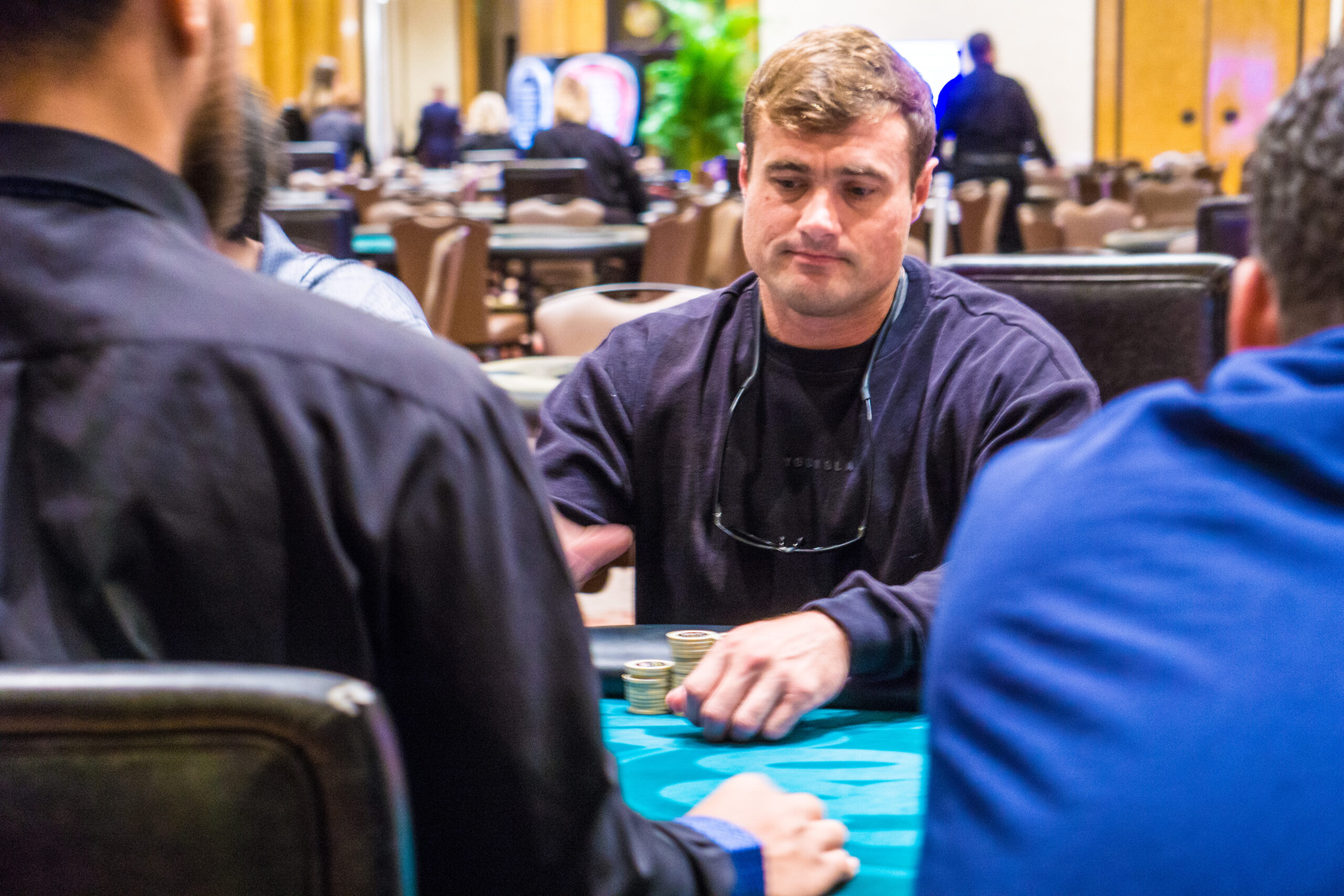 With seven players remaining from a field of 345, the average chip stack is around 985,000 (33 big blinds). The remaining players are guaranteed at least $11,100 each.