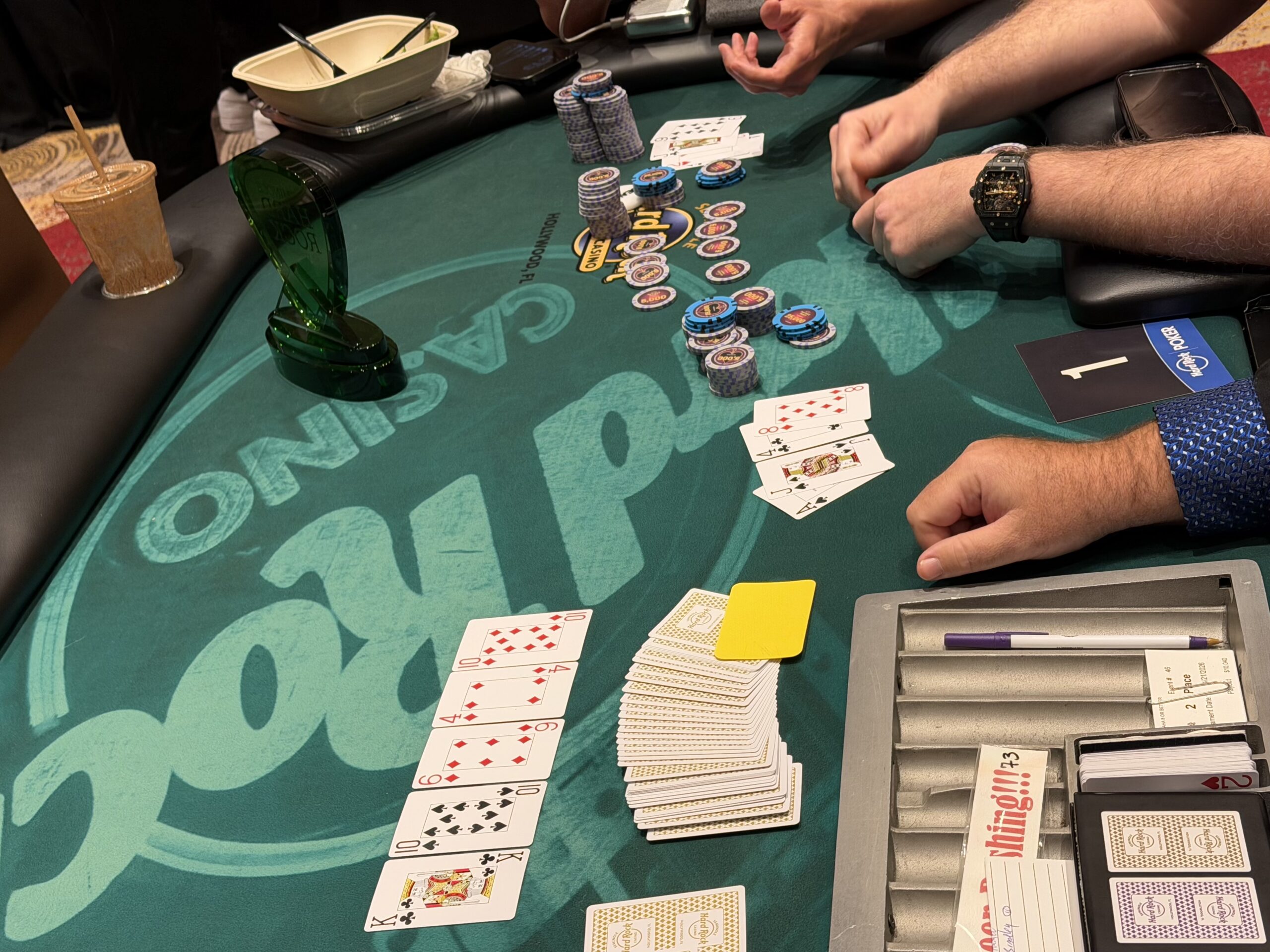 As best as we could tell, Ramos thought Lord had checked, but he didn’t. Ramos then bet 80,000, but Lord was facing the board (thinking it was his turn), and didn’t see Ramos’s bet.
