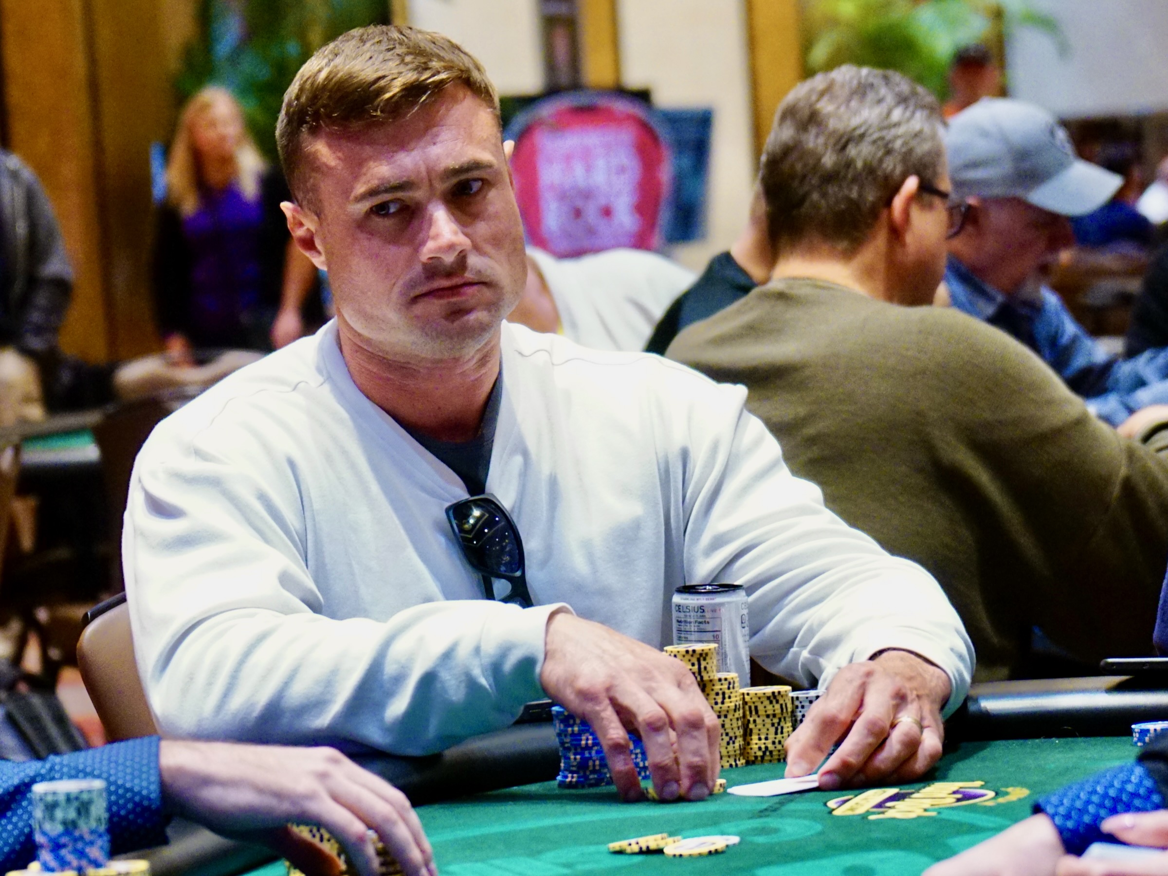 With 38 players remaining from a field of 102, the average chip stack is about 54,000 (7 Big Bets). The final 13 players will finish in the money, with a min-cash worth $835.