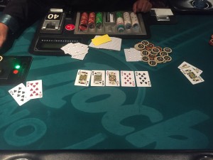 where Cardona bet 25,000. McLaughlin raised to 75,000, Newman reraised to 140,000, Cardona folded, McLaghlin reraised all in for 265,000 and Newman called immediately, slapping down