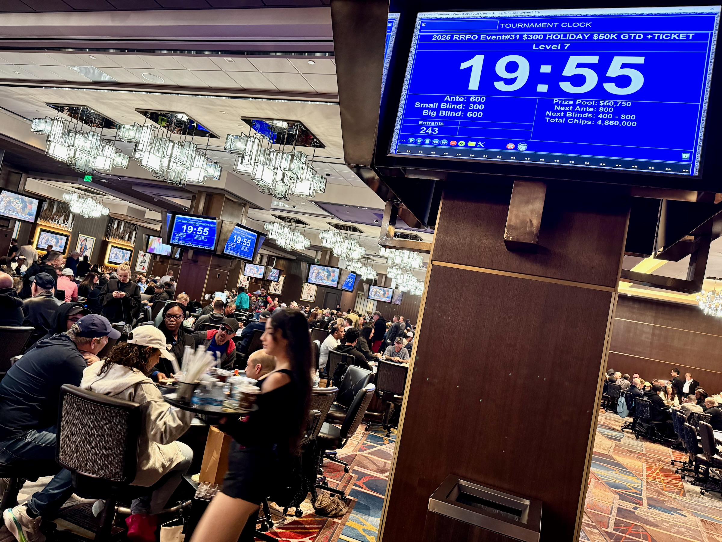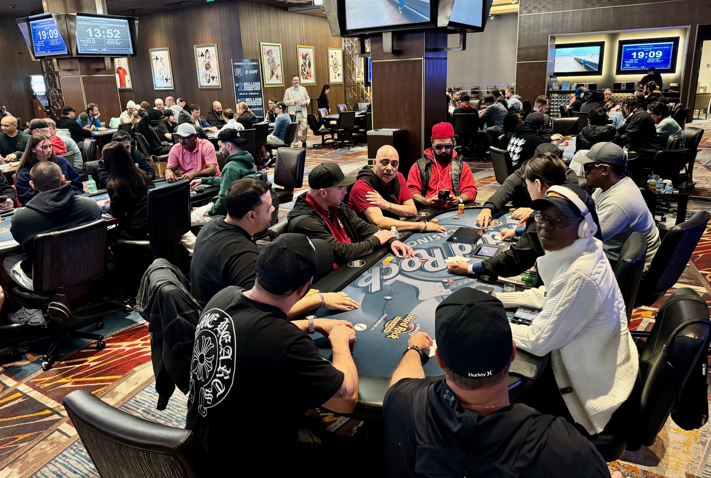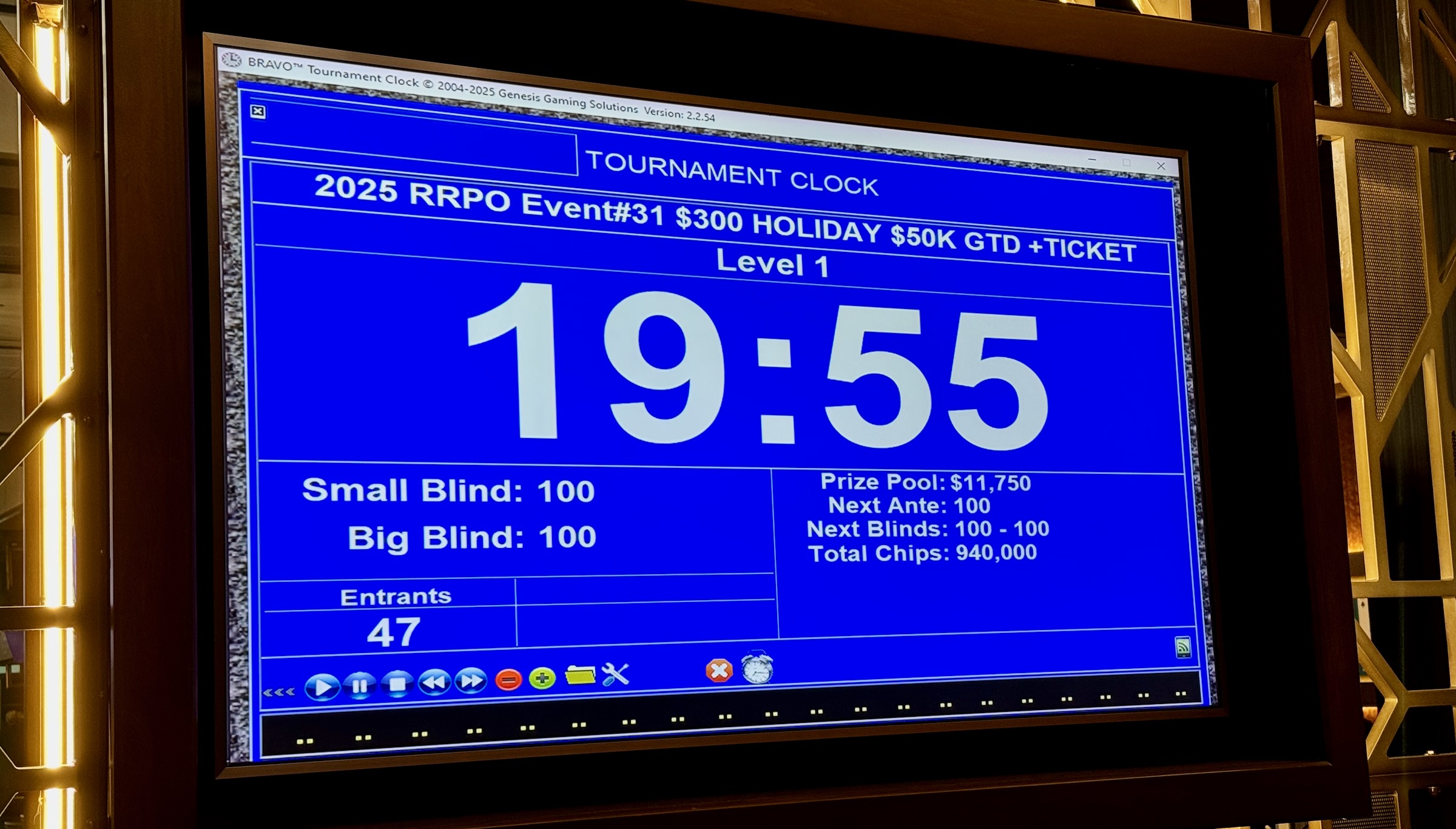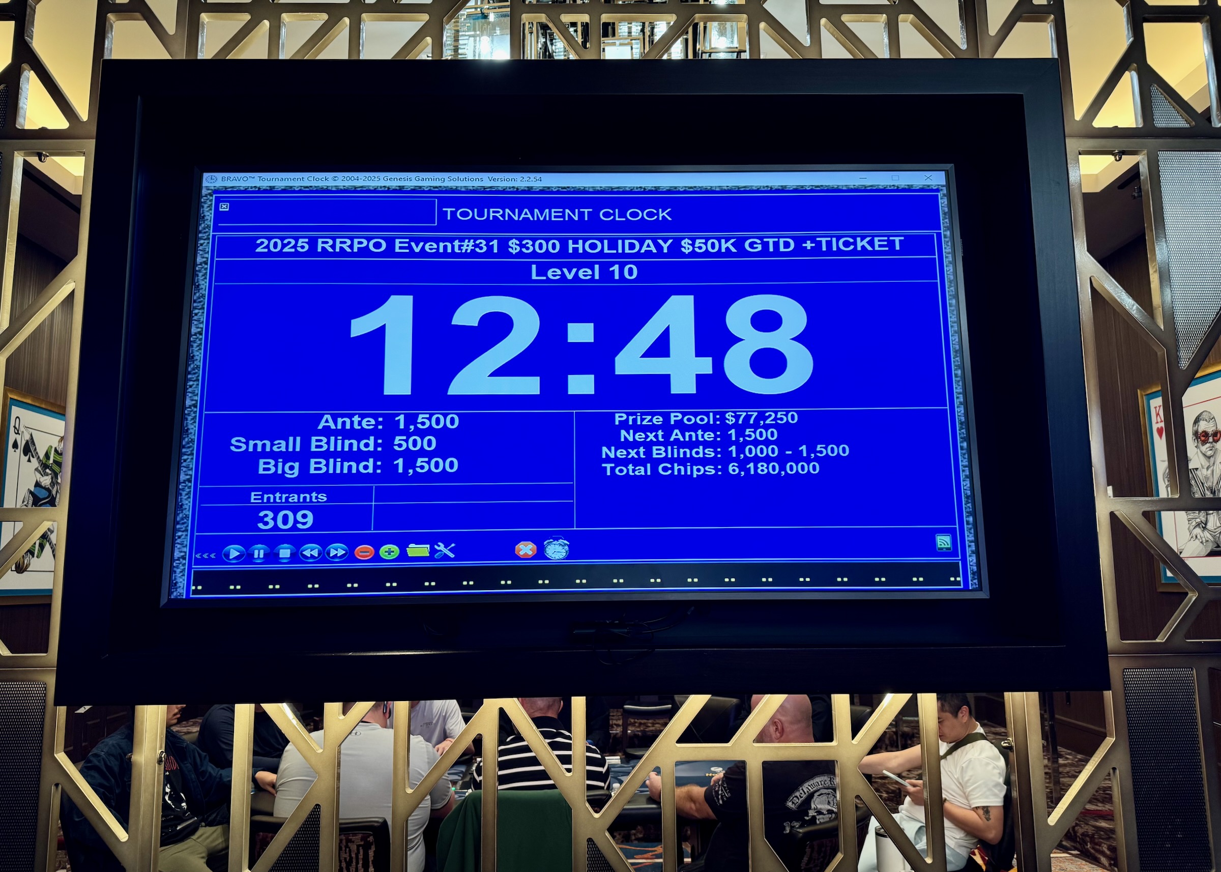 With five players remaining from the field of 309 entries, the average stack is about 1,235,000 (31 big blinds). The remaining players are guaranteed at least $4,420.