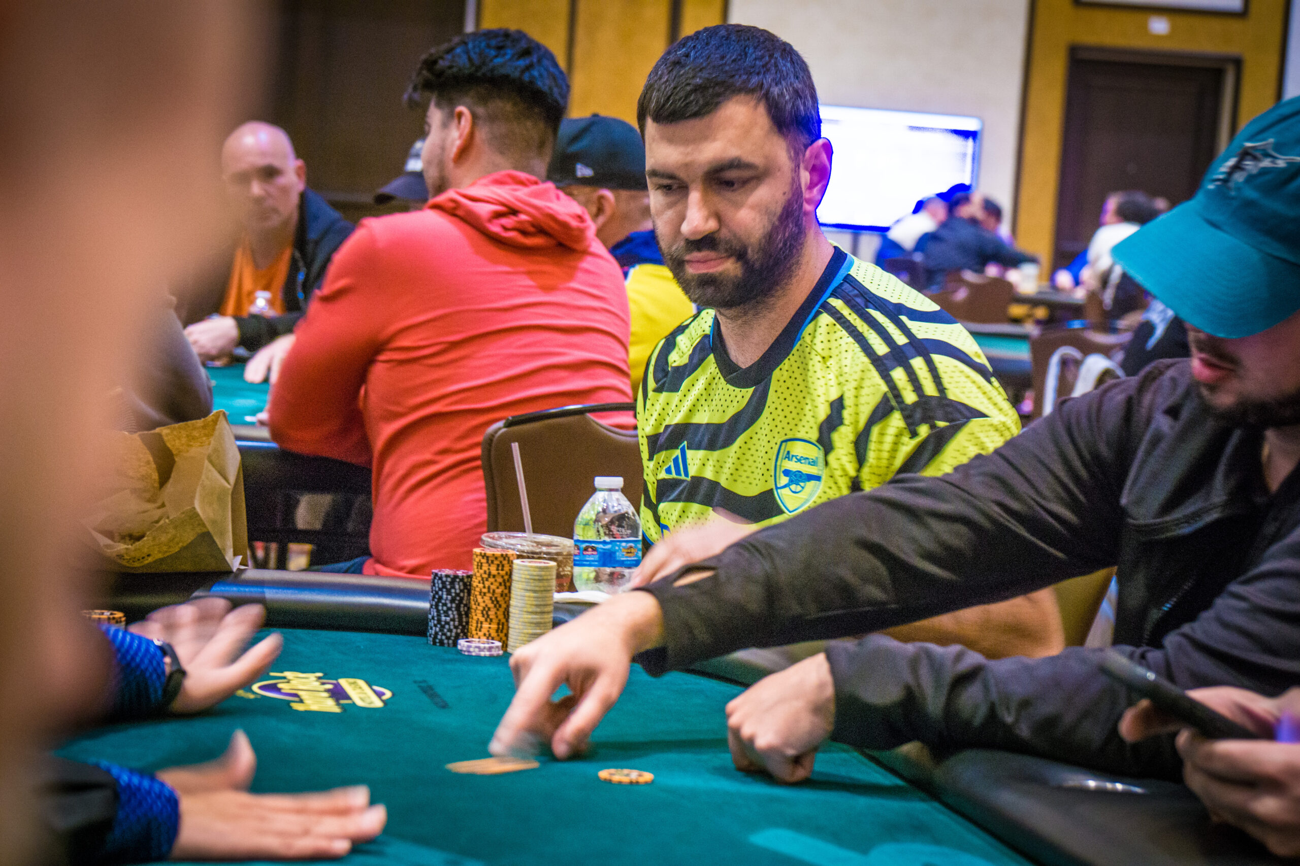 With 21 players remaining from a field of 65, the average chip stack is about 77,000 (10 Big Bets). The final nine players will finish in the money, with a min-cash worth $740.