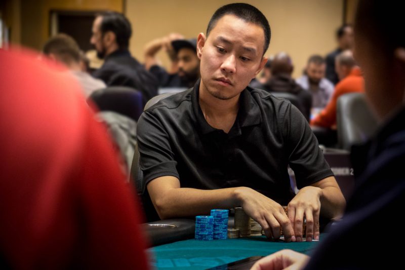 Despite coming to the final table with the chips lead, Adam Horowitz found himself in trouble against huge chip leader Gui Van.