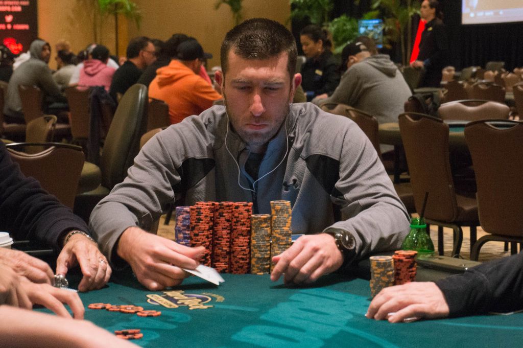 Players begin with 15,000 stacks and 30-minute levels throughout the opening flights. Late registration is open until the start of Level 13 around 11:45pm and players can re-enter any time during that period of they go bust.