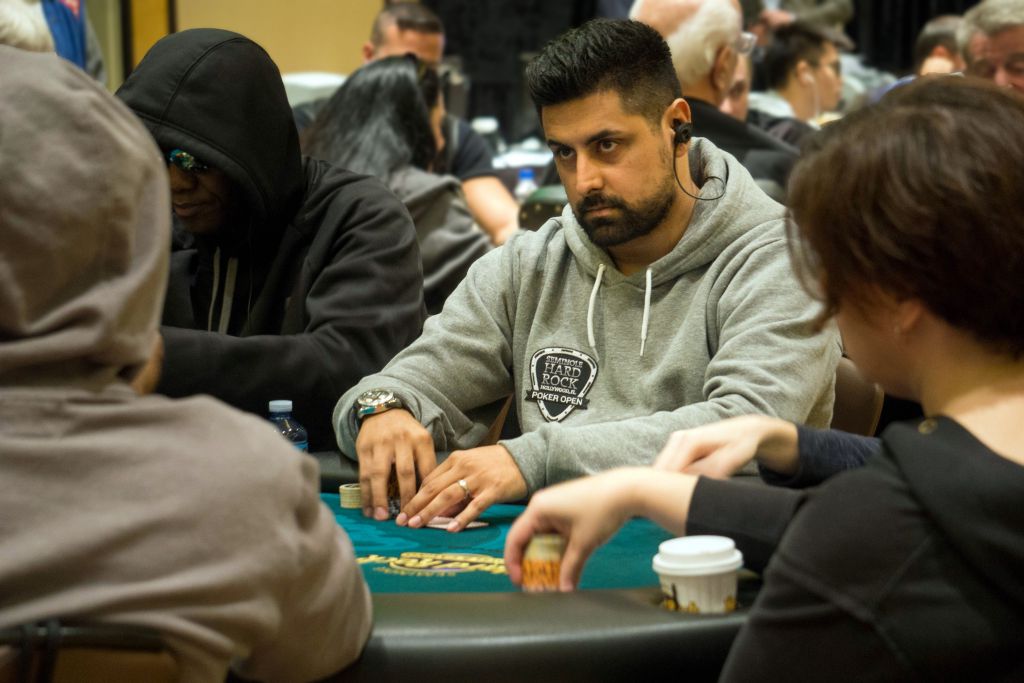 We found another one of Seminole Hard Rock Poker team members jumping in at the last minute. WPT Season XII Player of the Year Mukul Pahuja used his late entry option for a shot in the penultimate flight and he’s grinding away at a no-break table.