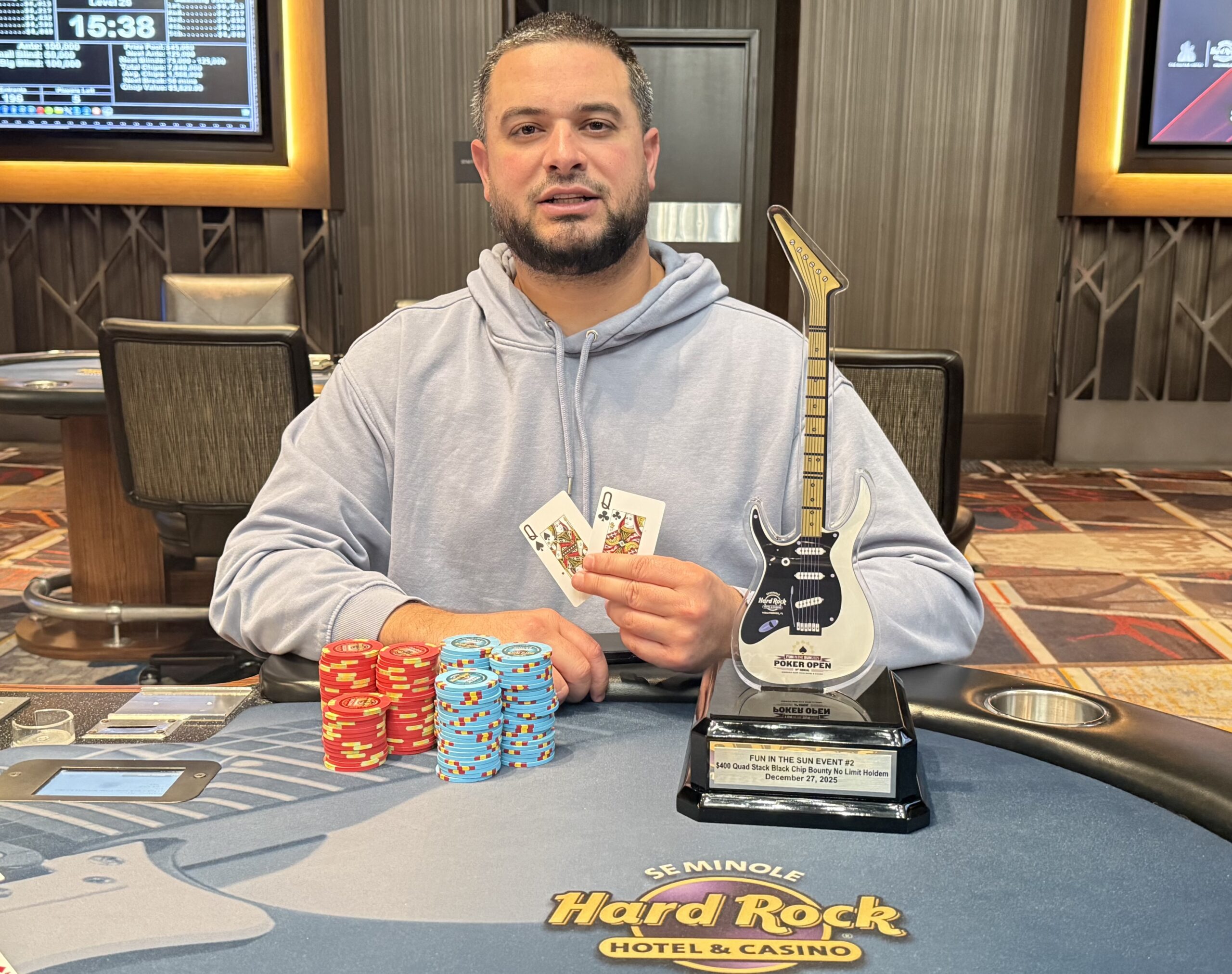 Event 2 of the 2025 Fun in the Sun Poker Open was a $400 Quad Stack Black Chip Bounty No-Limit Hold’em (Re-Entry). A field of 196 entries generated a prize pool of $45,080, with an additional $19,600 set aside for bounties.