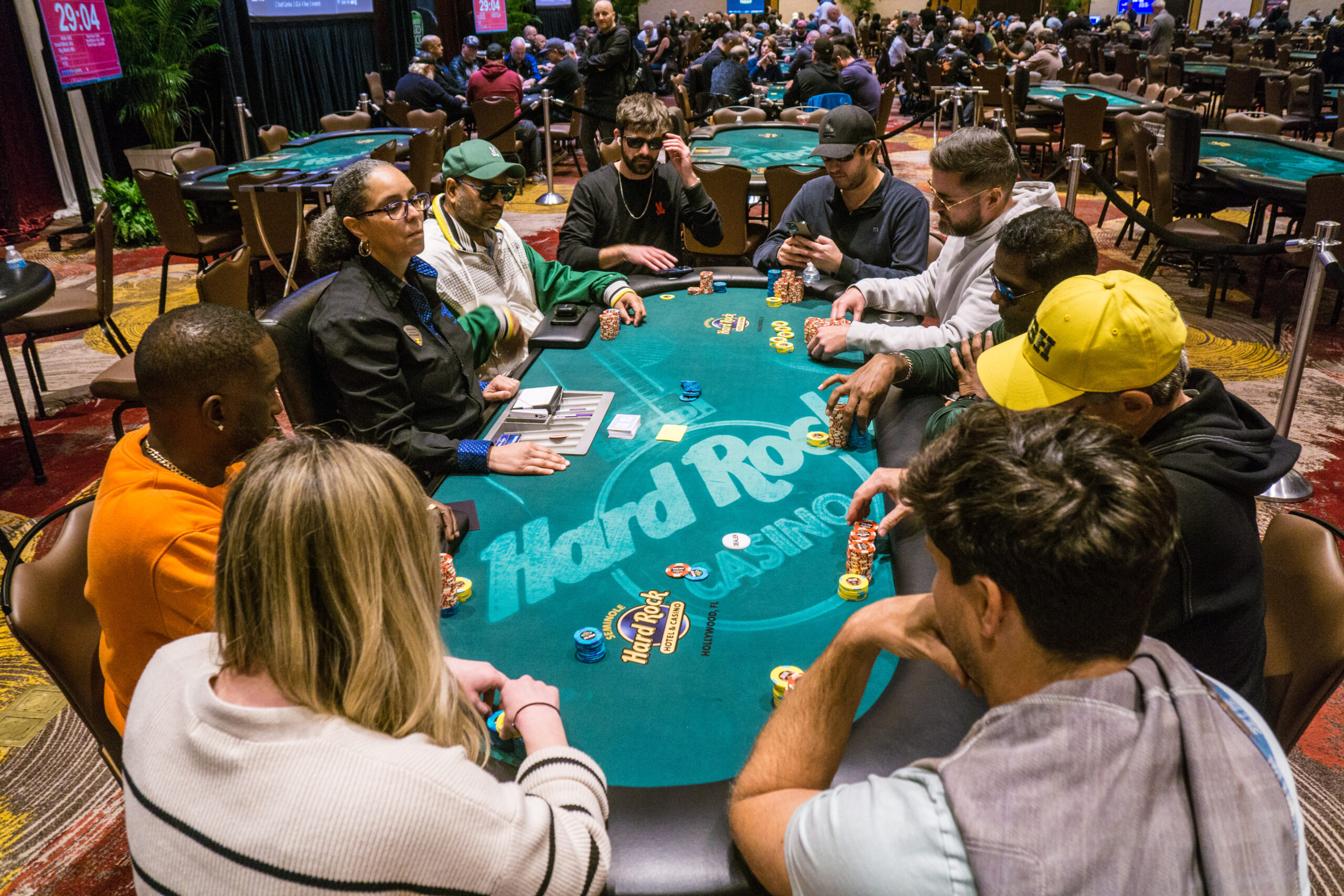 With nine players remaining from a field of 3,586, the average chip stack is around 7,975,000 (32 big blinds). The remaining players are guaranteed at least $27,500 each.