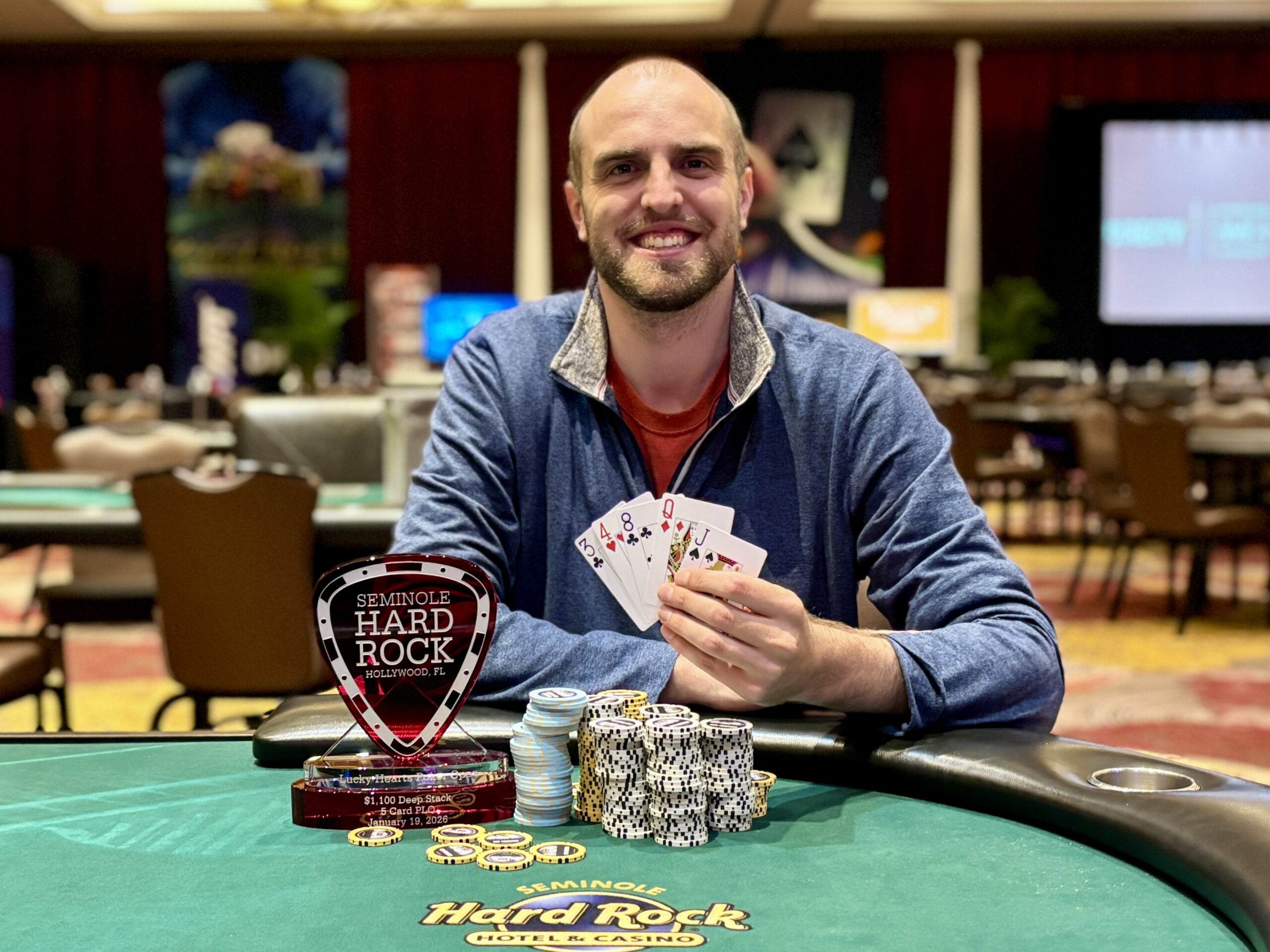 Event 53 of the 2026 Seminole Hard Rock Lucky Hearts Poker Open was a $1,100 Deep Stack 5-Card Pot-Limit Omaha, drawing 65 entries for a prize pool of $63,050. Taking it down was Ryan Hoenig, winning outright for $22,055 and his 7th SHRP major series trophy triumph.